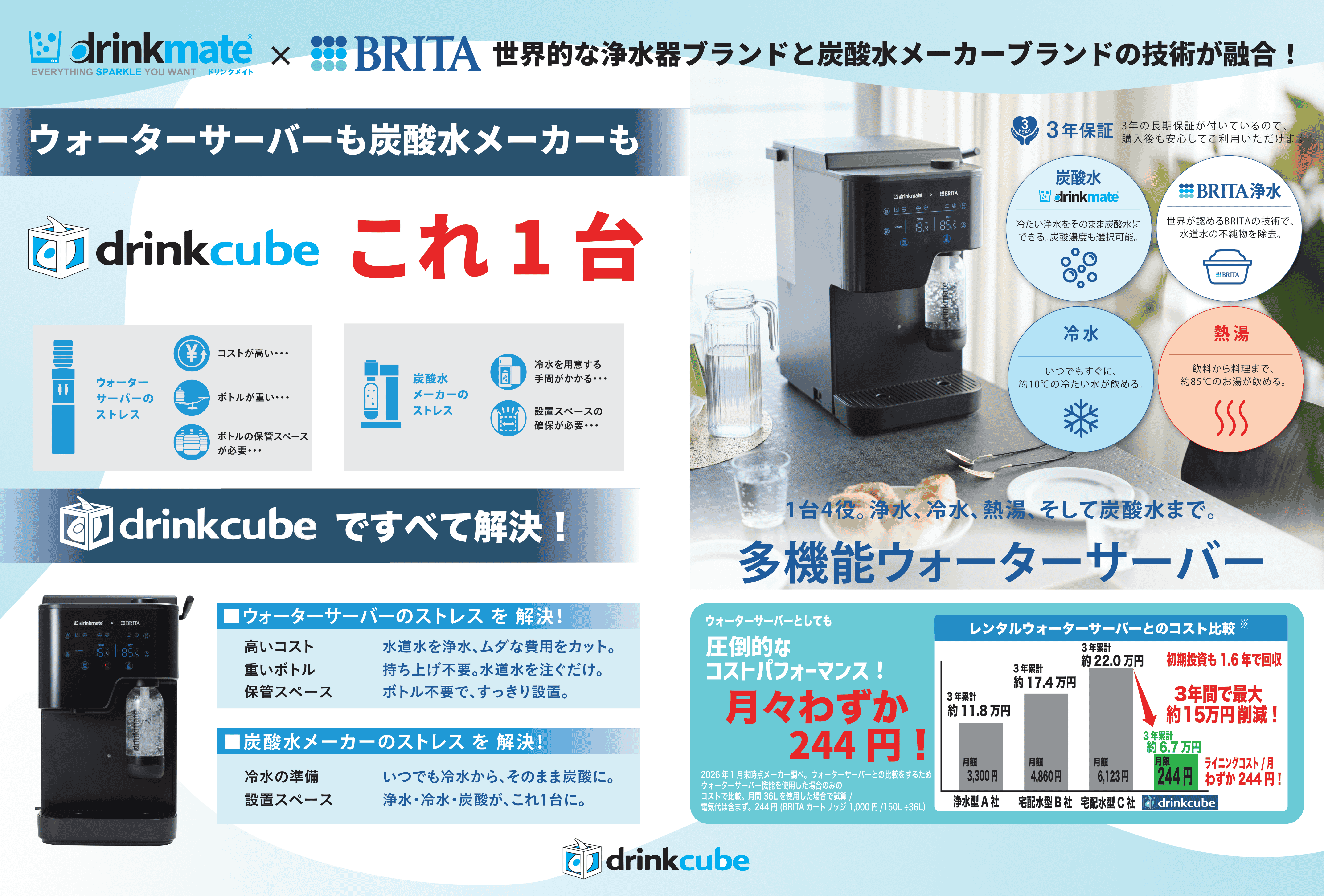 浄水・冷水・熱湯・炭酸水の機能を一台に集約した、多機能ウォーターサーバー『drink cube』を
